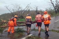 Handout photo from the Philippine Coast Guard shows coast guard personnel clear fallen trees off a highway in Catanduanes province after Typho…