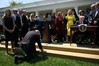 A man kneels in prayer in front of US President Donald Trump during a National Day of Prayer event in the White House Rose Garden