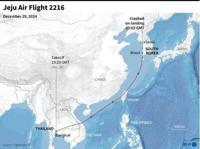 National News 179 dead in South Korea's worst plane crash John SAEKI Dec 29, 2024 Map showing the flight path of Jeju Air Flight 2216 before it crashed on landing at Muan International Airport, South Korea, on December 29
