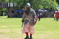 Perry County Medieval village risen in a Perry County field draws reenactors from throughout the New World May 11, 2022 Joe Farley in chainmail and helmet with sword and shield ready for battle at Dalowhinnie Fields.