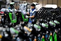 A worker assembles electric motorbikes at the Selex factory in Hanoi