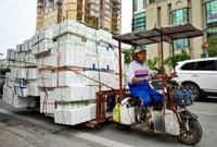 A man rides an electric motorbike carrying foam sheets on a street in Hanoi