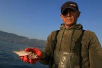 Fisherman Viktor Kocaj shows a lionfish, one of the tropical species now found in Vlora Bay