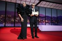 Brazilian director Kleber Mendonca Filho with Spanish actress Rossy De Palma at the Cannes closing ceremony