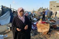 People inspect the damage after an Israeli strike on a camp housing displaced Palestinians in the southern Gaza Strip