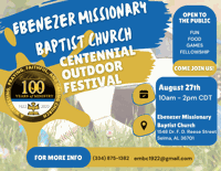 News Ebenezer Missionary Baptist to celebrate 100th anniversary Nathan Prewett Nathan Prewett Aug 2, 2022 Ebenezer Missionary Baptist will celebrate its 100th anniversary on Saturday, Aug. 27 and Sunday, Aug. 28.Â