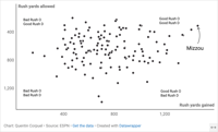On the other side, Mizzou’s opponents are averaging 50.4 plays per game, the fewest in college football. This kind of gap is rare, as MU is the only FBS team in the top 15 of most plays per game on offense and fewest plays per game allowed on defense.