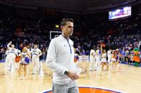 Jan 25, 2025; Gainesville, Florida, USA; Florida Gators head coach Todd Golden walks to center court after a game against the Georgia Bulldogs at Exactech Arena at the Stephen C. O'Connell Center. Mandatory Credit: Matt Pendleton-Imagn Images