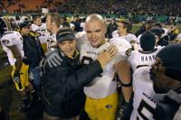 Missouri head coach Gary Pinkel and embraces offensive lineman Colin Brown after Missouri’s victory against Kansas on Nov. 24, 2007 on Faurot Field.