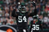 Oct 31, 2024; East Rutherford, New Jersey, USA; New York Jets defensive tackle Javon Kinlaw (54) reacts during the first half of their game against the Houston Texans at MetLife Stadium. Mandatory Credit: Ed Mulholland-Imagn Images
